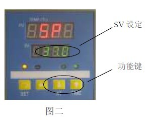 3.1 (见图二)按一下“SET”键,此时PV 屏显示“ ”,SV 屏显示设定温度值;