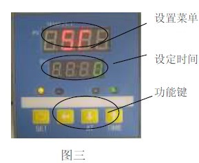 4.1 见图三,按SET 键4 秒后,PV 屏显示“ ”字符时,若SV 屏显示“0”,表明未设定定时功能(出厂状态)