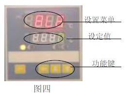 6.2(见图四)当温度到达:PV = SV + AL2时,即从高速转为低速运转,此时黄灯熄灭。