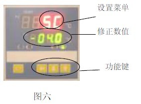 7.1.3 (见图六)再按“SET”键若干次,找到所需要调整的控制参数的“SC”提示符,按功能键,使该控制参数显示为所需要的值;SC = 原始SC值 +(实际温度 - PV显示值)