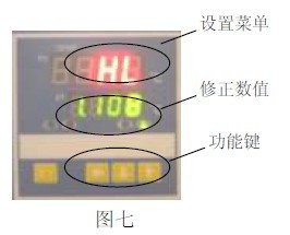 7.1.6 (见图七)按“SET”键,PV屏出现“H L”,将“H L”修改为1.000,再回到工作状态;