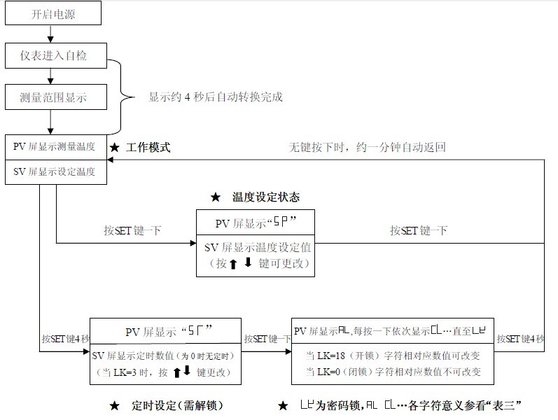 4.2 按SET键若干次,直到PV屏显示“L K”,通过 键使SV 屏显示3(定时开锁),再按一下SET 键,PV 屏回到“ ”通过 键,设定定时所需值(定时范围:1~9999 分),再按SET 键4 秒后,控温仪返回工作模式,定时即开始运行,此时AT灯闪烁,进入计算时间。定时终了,PV 及SV 窗显示“End”,AT 灯灭,蜂鸣器叫4次以示提醒;