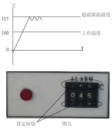 11.2 见图九,用面板上超温设定拨盘的+、— 按钮进行设定所需限温温度。