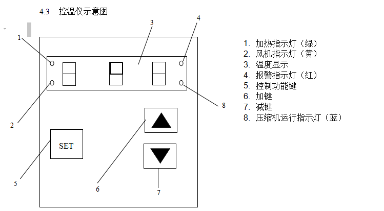 4.5.3 报警功能:该设备具有超过设定温度5℃超温报警功能,如需更改需由设备管理人员更改。